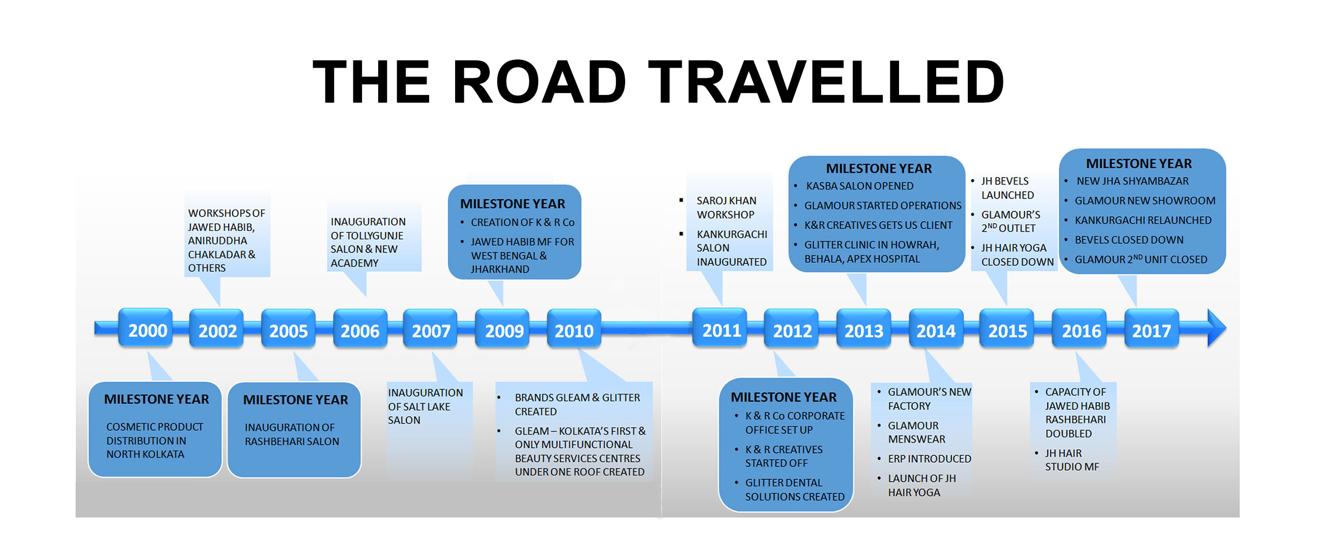 K & R Co. was established in 2000 by the husband-wife duo Kohinoor Mandal and Mrs. Reema Mondal to revolutionize the then Kolkata's perspective of visiting beauty parlours. Starting Jawed Habib Hair & Beauty in South Kolkata was a big step towards that particular goal. Eventually the idea of Glitter Dental Clinic popped up and found its way to reality in 2002. From then on, there is no looking back for the company.